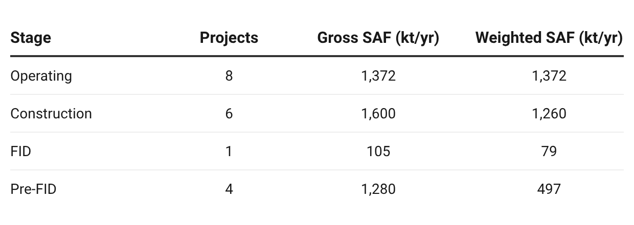 Weighted SAF capacity is gross capacity adjusted for the probability that the project actually commissions. Operating projects sit at 100% probability. Construction-stage projects run at 90% as a baseline. FID-stage at 70%. Pre-FID at 40%. Announced concepts at 20%. Cancelled at 0%. The Tracker also adjusts these baselines up or down on a project-by-project basis where evidence warrants.