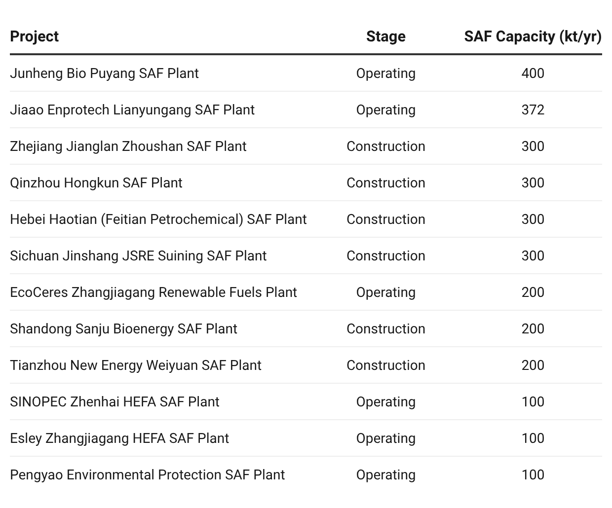 Operating and construction-stage Chinese projects together account for 2,632 kt/yr of weighted SAF capacity. At the 1.20 yield ratio, that implies roughly 3,160 kt/yr of lipid feedstock demand inside China. If even half of that is sourced as UCO, the domestic Chinese UCO requirement from this segment alone approaches the entire 2024 Chinese export pool. The construction-stage projects below will commission over the next 24 to 36 months.
