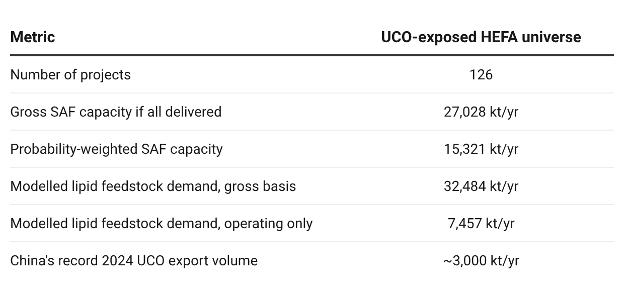 Operating projects alone, with their probability of commissioning fixed at 100% because they are already running, require approximately 7,457 kilotonnes per year of lipid feedstock. That is roughly 2.5 times China’s record 2024 export volume. UCO is a portion of that lipid demand. The rest is covered by tallow, PFAD, and vegetable oils. But the competitive pressure on UCO molecules is set by the size of the lipid pool, not just the share of UCO within it.